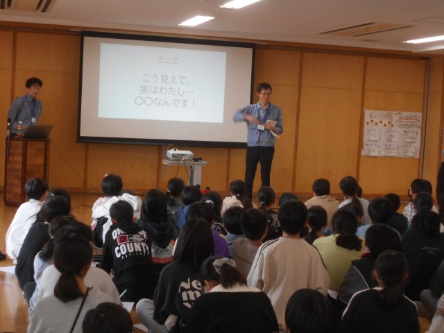 こちらのクラスは、鉄の加工技術について学びました。様々な金属板のサンプルを実際に触って、硬さや重さ、色の違いを見たり、実際に会社で作った鉄のサイコロを見せていただいたりしました。身の回りには鉄がたくさん使われており、私たちの生活に欠かせないものであることを実感し、富山県が「ものづくり」がさかんな県であることが、よくわかりました。