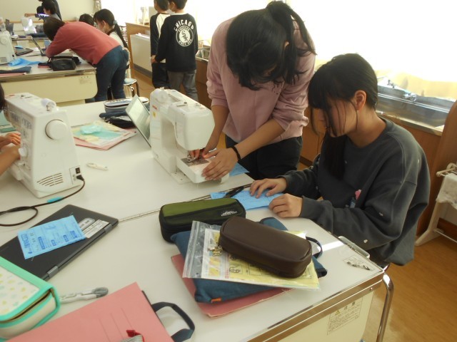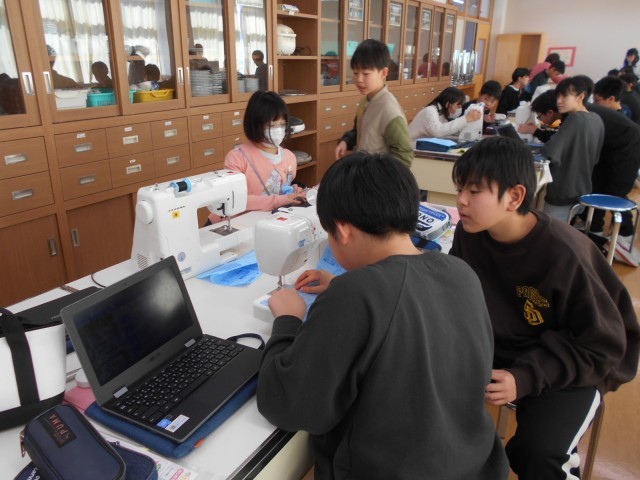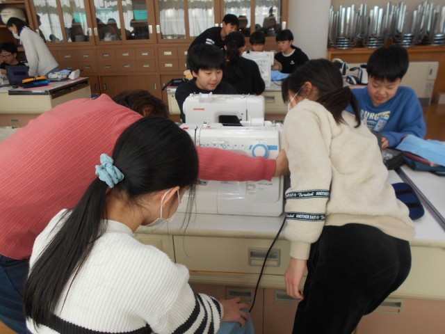 1月21日(水)の家庭科の時間に、ミシンボランティアの方々に来ていただいて、学習を行いました。初めてのミシンの学習に戸惑いつつも、先生やボランティアの方々に教えていただき、使い方を知ることができました。今後、エプロンづくりに取り組みます。