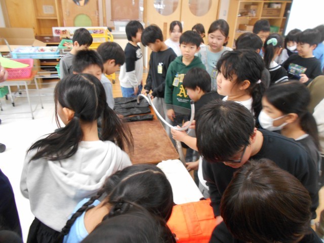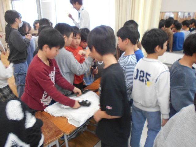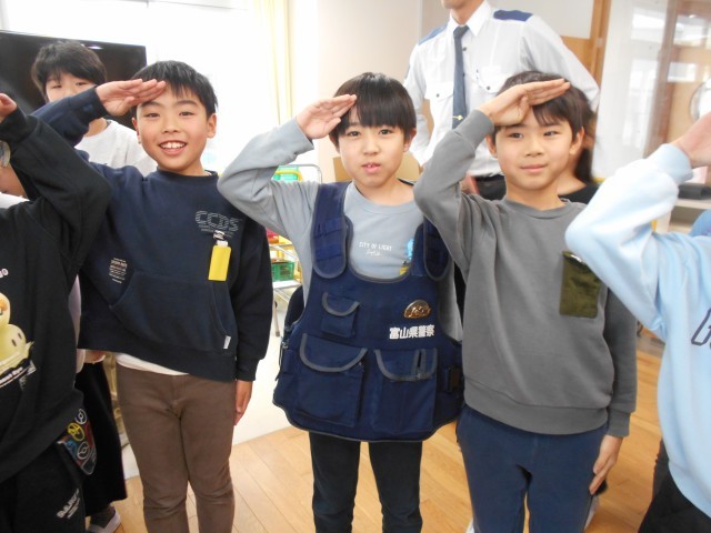 警察の方が普段身に着けておられる装備品を実際に触れさせて頂きました。子供たちは「重い!」「これで動くのは大変だな」と言いながら10kg以上ある重たい装備を身に付け仕事をしておられる大変さを実感していました。