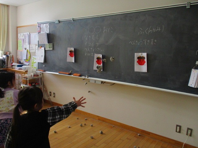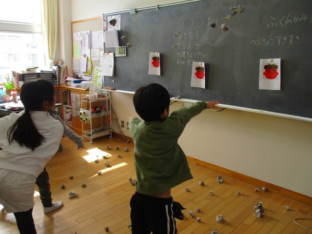 今日は節分の日。鬼退治の豆まきをしました。自分の心の中にある出ていってほしい鬼に、新聞紙で見立てた豆を投げました。「泣き虫鬼」「わがまま鬼」「勉強いやいや鬼」など、「鬼は外、福は内」。みんなで大きな声で豆まきをしました。それぞれの鬼は退治できたかな。