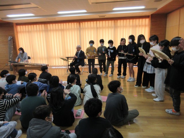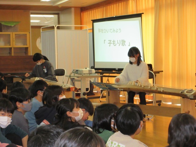 今週は、琴と尺八の先生をお招きし、目の前で演奏を聞かせていただきました。和楽器がもつ独特の音色を感じ取り、楽しみながら鑑賞に取り組んでいました。また、後半には代表児童が琴の演奏も行い、日頃の音楽での学習の成果を披露していました!