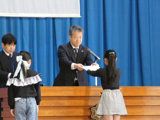 今日は、修了式と校長先生のお別れ会を行いました。子供たちは、この1年間のがんばりを振り返りながら、堂々とした態度で式に臨みました。4年生の学年目標は、「ハーモニー ~心を一つに~」。子供たち一人一人は、いろいろな個性があり、特技があり、様々な音を奏でているけれど、みんなが集まれば心が一つになり、運動会、自然体験学習、学習発表会等、みんなで協力しすばらしい力を発揮しました。それも保護者の皆様のご協力、ご支援があったからこそです。1年間、本当にありがとうございました。
