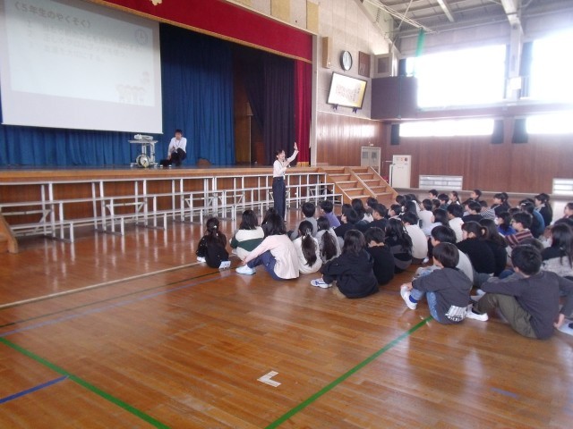 今年度初めての学年集会がありました。学年目標や学年のきまりを確認し、高学年としての意識が高まりました。最後は、全員でじゃんけん列車をして楽しみました。
