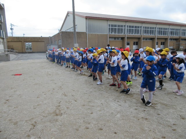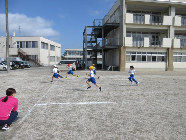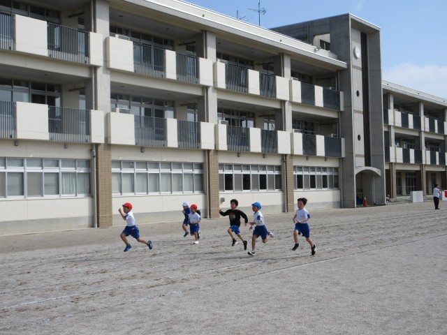 学年全体で、体育をしました。走り方をみんなで学んだ後、50m走の記録を測定しました。1年生のときより、記録をのばすために、がんぱっています。