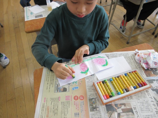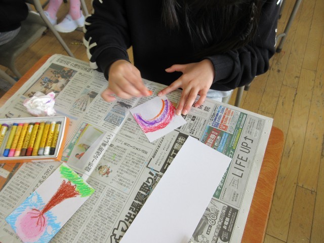 図画工作科の学習で、春を感じる絵を描きました。クレヨンで、線の太さや色の濃さをかえたり、ティッシュなどでぼかしたりするなど、描き方を工夫しながら作品を仕上げました。