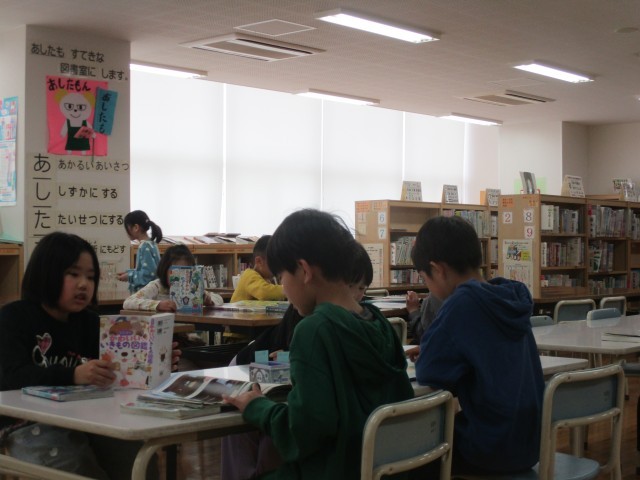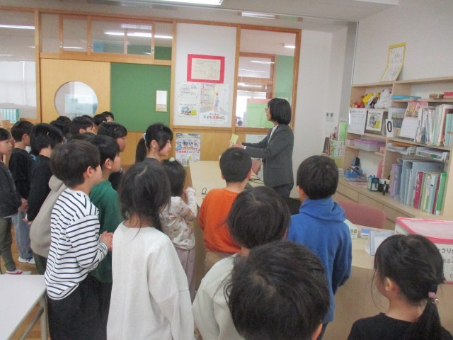 2年生になり、初めて図書室で本を借りました。学校司書の先生のお話を聞き、約束を守って利用しました。2年生でもいろいろな本に親しみ、本が大好きな子供に育ってほしいです。