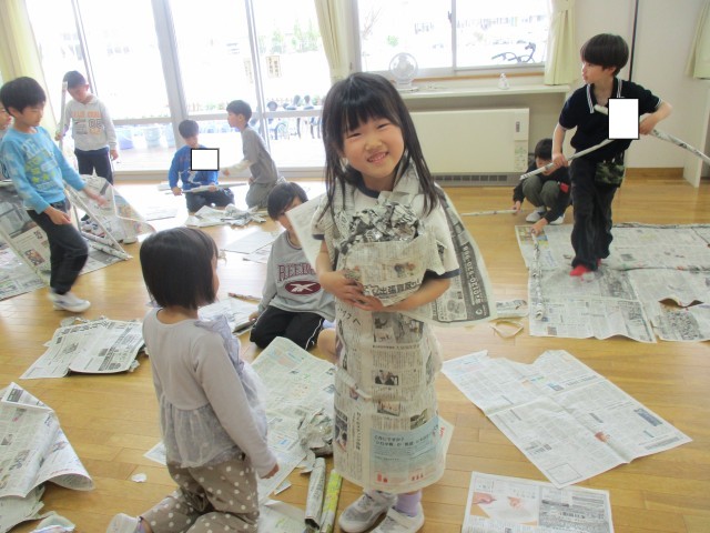 図画工作科「しんぶんしとなかよし」の学習では、新聞紙をかぶったり、やぶったり、丸めたりし、できた形を組み合わせて遊びました。新聞紙の素材の面白さを体全体で味わいました。