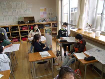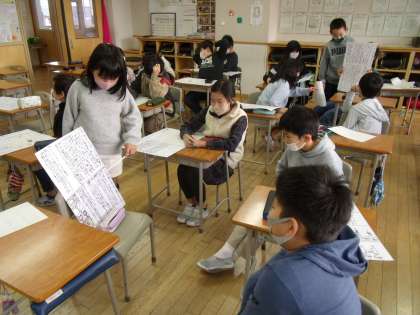 子供たちは、これまでの総合的な学習の時間において、地球環境について調べたり、その環境を守るために自分にできることを考え取り組んだりしてきました。今日は、これまで自分の取組をグループで伝え合いました。