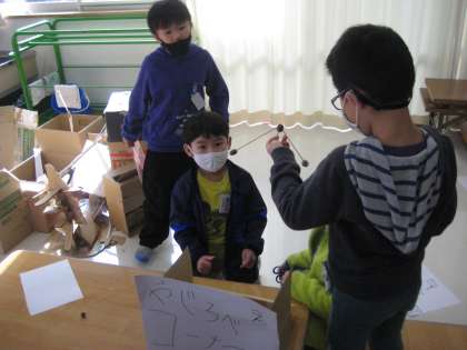 生活科「あきをたのしもう」の学習では、1組と3組で秋のフェスティバルをしました。ほかのクラスの友達をお客さんとして迎え、お互いのおもちゃで楽しみました。