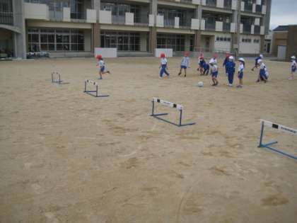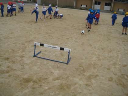 体育科の学習では、ボールを蹴って的に当てるゲームをしています。点数を競いながら、どうしたらたくさん点数が入るか、考えながら活動しています。