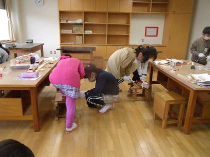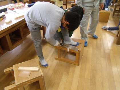 図画工作科でノコギリの使い方を学習しました。初めてノコギリを使うという子供も多く、緊張した様子で制作活動に取り組みました。