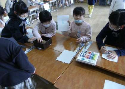 生活科の学習では、5組と6組がお互いのクラスのドングリや落ち葉、マツボックリを使って作ったおもちゃや楽器等を楽しみました。楽しみながら、他のクラスの工夫やすてきな所を見付けた子供達でした。