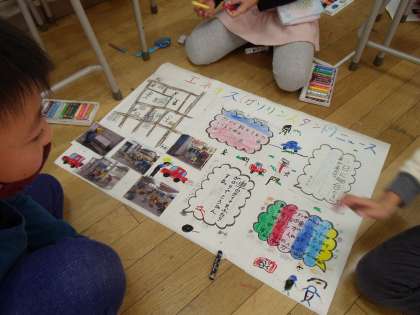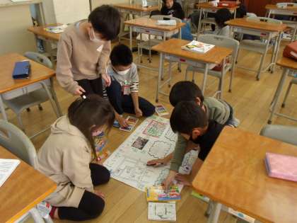 生活科「わくわくどきどきまちたんけん」で見付けた秘密や素敵を伝える発表会の準備を始めました。地図に印を付けてどこに行ってきたのか分かりやすくしたり、そこで出会った人の似顔絵を描いたりして、それぞれのチームで工夫を凝らしていました。
