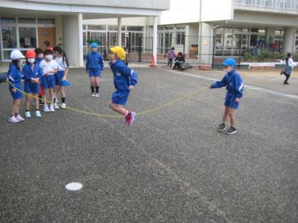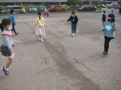リフレッシュタイムには、サブグラウンドで大縄跳びや短縄跳びで遊んでいます。たくさん体を動かしています。
