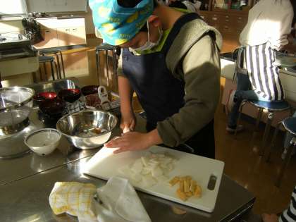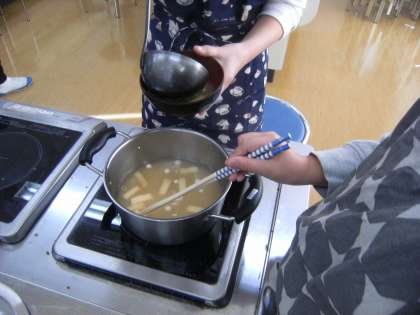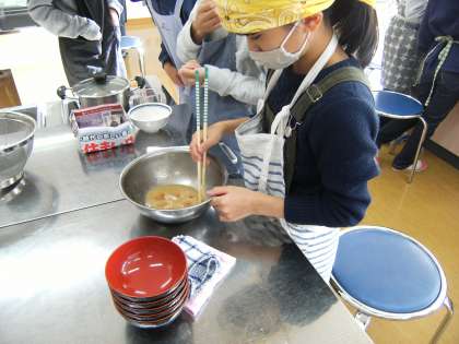 家庭科の学習では、みそ汁づくりに挑戦しました。これまでの調理実習の経験や家での手伝いの経験を生かしながら、どの子も器具の使い方を理解し、協力して取り組んでいました。調理しているときは真剣そのものです。最後には、「おいしい」と笑顔で試食する様子が多く見られました。