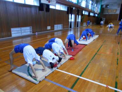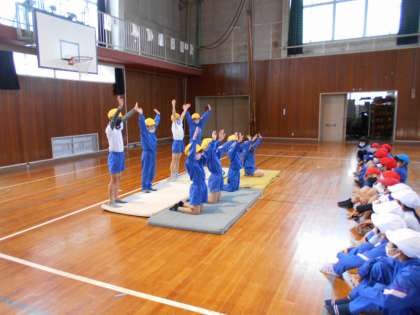 今日は、体育のマット運動最終日でした。これまで取り組んできたチームマットの発表会です。どの団も見事な個人技と団体技を組み合わせ、工夫した発表となりました。「○団のブリッジがそろっていてきれいでした」「○団は、開脚後転がとても上手でした」と感想を述べ合いました。