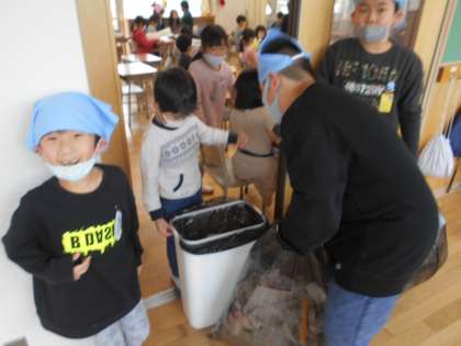 自分の教室のごみだけではなく、1年生の教室のごみ箱のごみも進んで集めています。ごみ捨てが終わった後は、しっかりと手洗いを行っています。