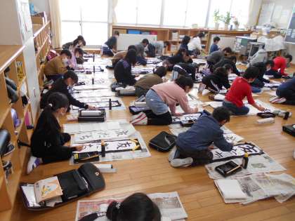真剣に始業式の話を聞く子供たちと、集中して書初め大会に取り組んでいる子供たちの様子をお伝えします。