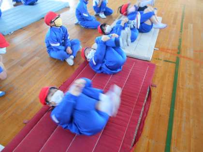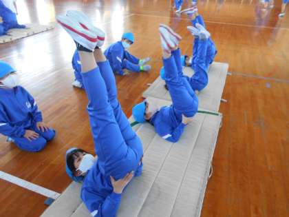 体育科の学習では、マットを使った運動遊びを始めました。マットに背中やお腹などをつけていろいろな方向に転がったり、手で背中を支えて逆立ちをしたり、体を反らせたりするなど、マットの上でたくさん体を動かしました。