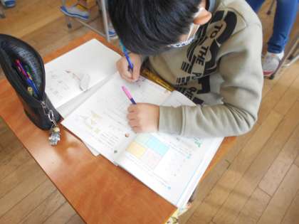 陣取りゲームをして、とった陣地の広さを比べました。どのように比べると分かりやすいかを話し合い、1辺が1cmの正方形である1平方センチメートルを使うとよいことを学びました。