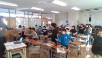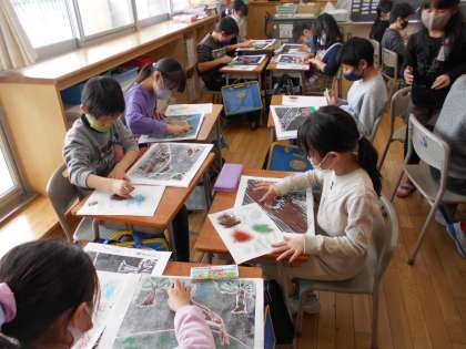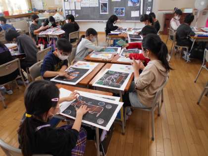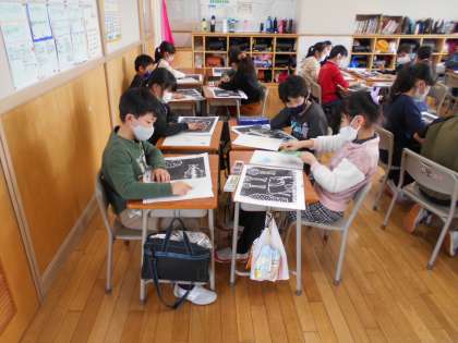 今日は、前回刷り終えた版画の作品に、粉クレヨンで色を付け仕上げました。粉を指でぼかすように塗っていくうちに、モノクロの作品が鮮やかに変化していく過程を楽しみました。