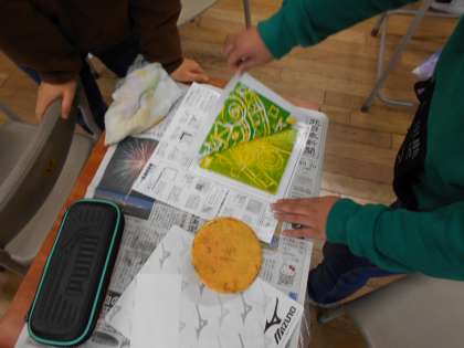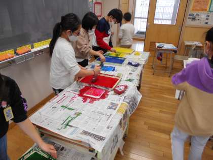 図画工作科の学習で一版連結版画に挑戦しました。色を変えながら版を並べて大きな作品にしたり、色や和紙の向きを変えて重ねたりしながら作品をつくりました。