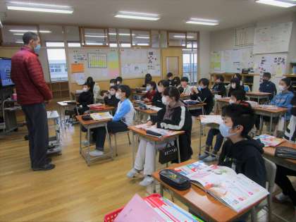 外国語の学習では、「Why do you like winter?」「We have ○○ in winter.」などの表現を使い、ALTの先生と好きな季節を紹介する文について学習しました。また、分かりやすく紹介するためにポストカードを楽しんで作成する様子も見られました。