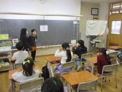 子供たちは、感染予防に努めながら、学級のみんなが楽しめる催しを企画・実行しています。この日は、献立係が食材クイズ大会を開きました。