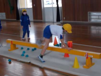 体育科「マットをつかった運動遊び」では、自分だけの「マットうんどうアトラクション」を考え、練習しています。坂道マットの上から丸太転がりをしたり、平均台を川跳びしたり、球を並べその上を跳び越えるかえる跳びをしたりするなど、技を入れながら自分のアトラクションを楽しんでいます。友達と協力して準備したり声を掛け合ったりしながら、団のみんなで頑張る姿が微笑ましいです。