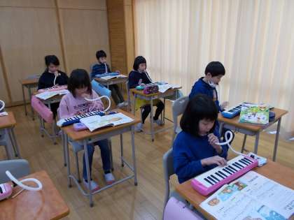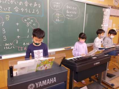 「みんなであわせて楽しもう」の授業で、合奏を楽しみました。「小ぐまの2月」の3つのパートの旋律を、鍵盤ハーモニカや木琴、キーボード、バスマスターで合わせ、「響きがきれい」「低い音と高い音が合わさっていい感じになった」「すてきなハーモニー」と心を動かした子供たち。楽器や音量のバランスを変え、いろいろな組み合わせでいろいろな音色を生み出しました。