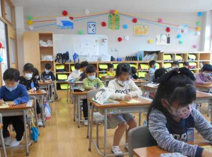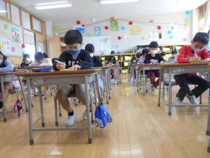 1年生は、小学校に入って初めて名前を書く学習をしました。よい姿勢で、自分の名前を一生懸命書いていました。鉛筆の持ち方の練習も続けていきます。