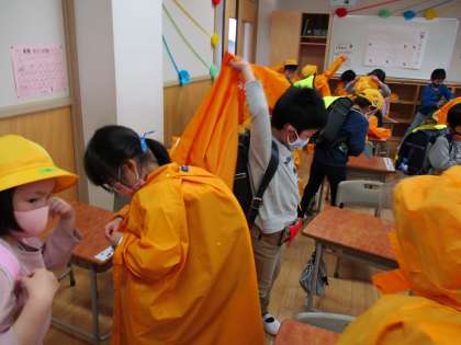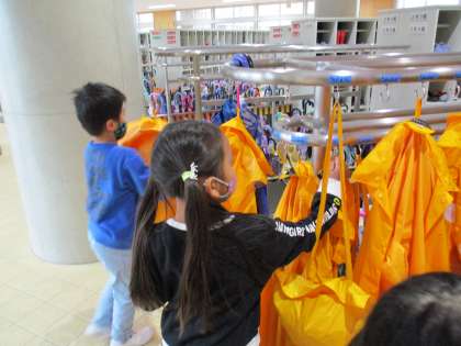 登下校時、強い風や雨の中、一生懸命歩いています。学校に着くと合羽を脱いで玄関のフックに掛け、帰りはランドセルの上から「よいしょ」と合羽を着ることを、よく頑張っています。毎日の頑張りを褒めてあげてください。