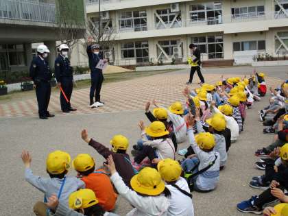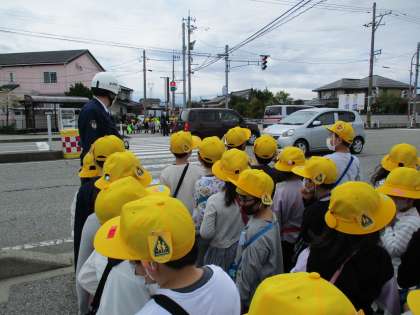 1年生は、交通安全教室で警察署の方に安全な歩き方や横断の仕方を教えていただきました。その後、通学路を歩き、教えていただいたことを実践しました。道路の端を一列で歩くことや、左右をよく見て横断することに気をつけて歩きました。