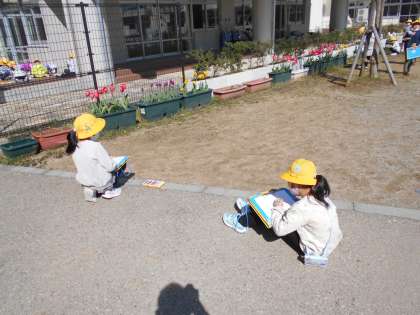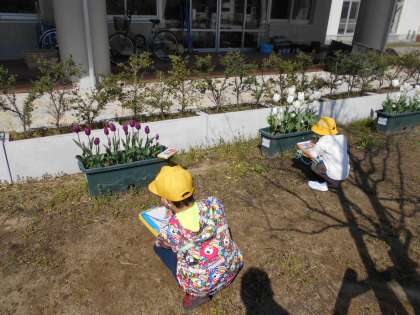 サブコートで春を感じるものをスケッチしました。チューリップの花びらの形や色をよく見て、丁寧に描きました。