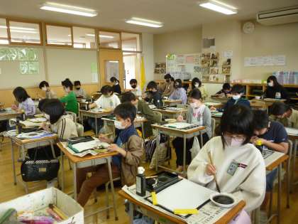6年生で初めての図工の授業が始まっています。墨と水の量や筆先の形を工夫して水墨画に挑戦しました。表し方をいろいろ試しながら、自分が思い描いた世界に没頭して作品を仕上げました。