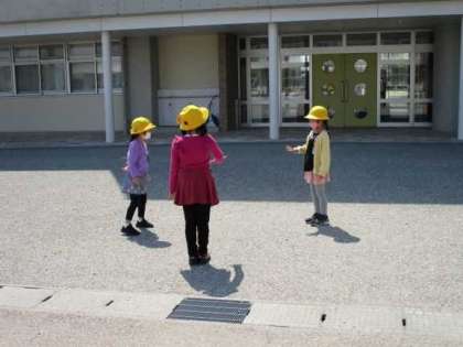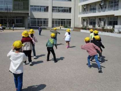 天気がよかったので、サブコートで仲良く遊びました。友達と声をかけ合って、ジャンケンやだるまさんころんだをしました。