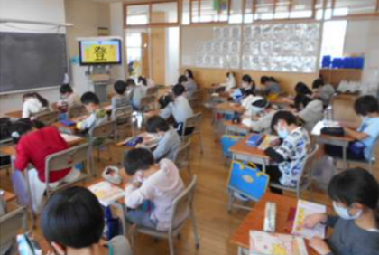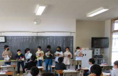 雨で退屈していた野ねずみたちが、きつつきのおかげで楽しい一時をすごす場面を、気持ちを込めて音読しました。