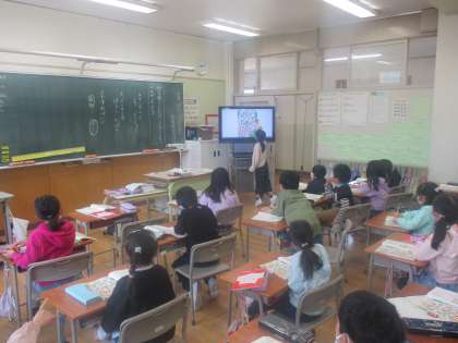 教科書に載っている「まい子のお知らせ」のアナウンスを参考に、子供たちがお知らせの文章を考えて発表しました。