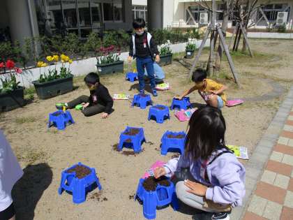 春になり、いろいろな動植物が活発になってきた様子を観察しました。ホウセンカの種も観察し、種まきをしました。