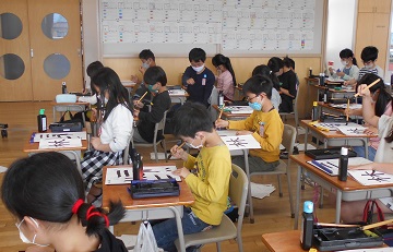 書写では、「林」の毛筆を行いました。へんとつくりのバランスを考えるとともに、3年生の時に学んだ縦画や横画、右払い等の筆遣いにも気を付けていました。