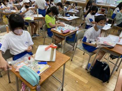 図画工作の学習では、ビー玉がおもしろく転がるように、楽しいコースを考えています。アイデアいっぱいで、みんなが遊びたくなるようなコースになるよう、真剣に作る姿が見られます。