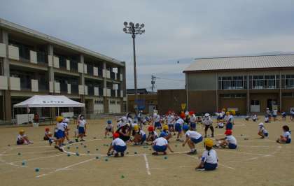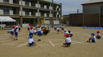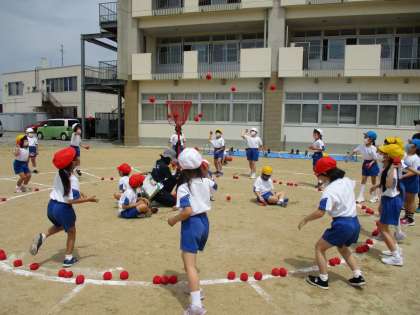 力を合わせて玉入れを行いました。玉出し役の子供たちは、周りの子供たちが受け取りやすいように、位置を考えて玉を転がしていました。