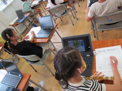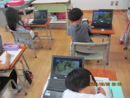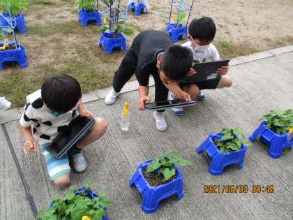 アサガオの茎が伸び、濃い緑色の葉が広がってきました。アサガオの成長の様子をクロムブックのカメラで撮影し、その静止画を見ながら観察カードに絵を描きました。葉の色や形をより詳しく見ながら記録できて、子供たちは嬉しそうでした。