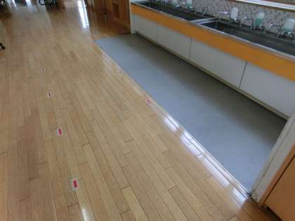 教室や廊下等に貼ってあった距離をとるための目印のテープも貼り替えました。また、手洗い場の取っ手を接触面積の少ないハンドルタイプに交換したり、除菌用の器具をさらに充実させたりしました。国や県や市のガイドライン等に従い、新型コロナウイルス感染症拡大防止の対策を適切に講じて2学期の教育活動を進めていきます。