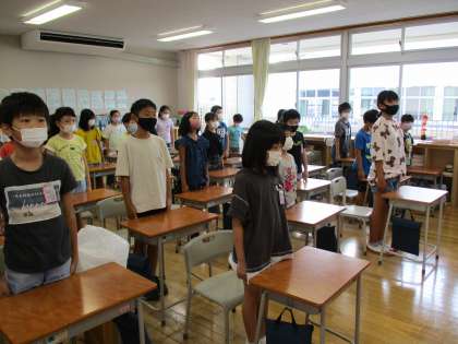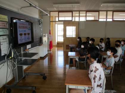 久しぶりに子供たちの元気な顔を見ることができてうれしかったです。始業式で放送を真剣に聞いている様子と、健康や安全のプレゼンを見ている様子です。
