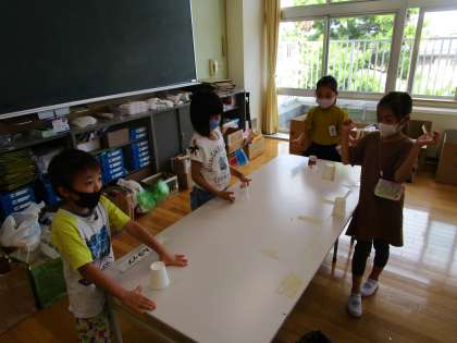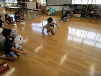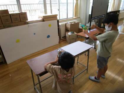 生活科の学習では、身の回りの材料を使って動くおもちゃをつくりました。上手く動くようにいろいろな工夫をしたり、つくったおもちゃを動かしたりしました。さらに動きをよくしようとしたり、遊び方を考えたりして意欲的に活動しています。