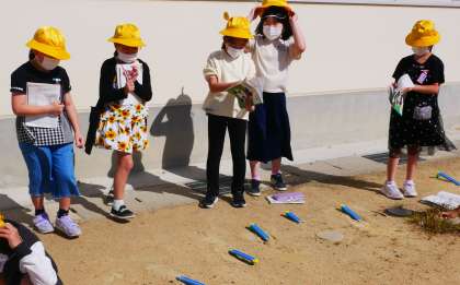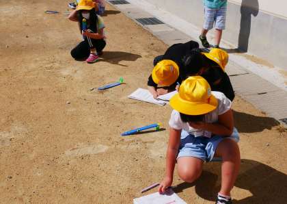 日なたと日かげの地面の温度がどのくらい違うのか、温度計を使って調べました。正午ごろの日なたの地面の温度は40度を超え、子供たちは、驚きを隠せない様子でした。