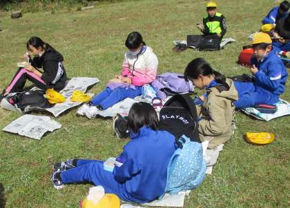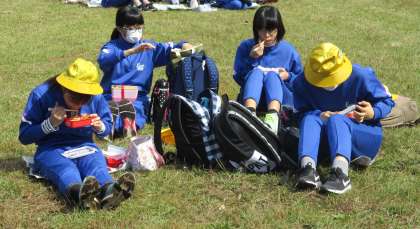 お昼の時間には、グループごとにお弁当を食べました。同じ方向を向く、マスクを外した後は話さないなど、学校で気を付けていることをしっかり意識していました。