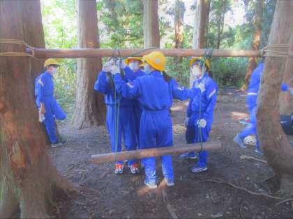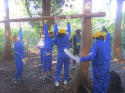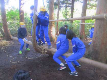森の遊び場づくりの活動では、丸太やロープを使い様々な遊具を作りました。縄の縛り方に最初は苦労していた子供たちでしたが、お互いに協力して声を掛け合いながら取り組んでいました。作った遊具で遊んでいるときの笑顔がとても輝いていました。