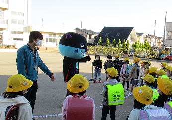 よふかしおには、運営委員会と子どもたちと一緒に挨拶運動をしてくれました。そして、「早寝早起き朝ごはん」を呼びかけました。